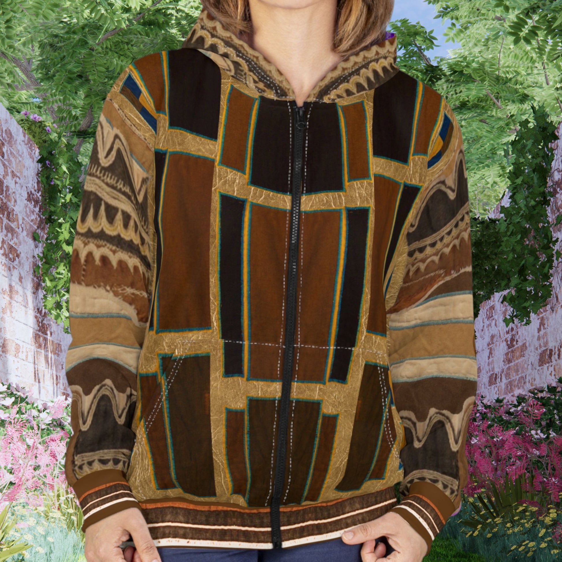 Channeling the bold spirit of tunics worn by19th-century Sudanese Mahdist warriors, this unisex zipper hoodie jacket gives timeless vibes in distinct shades of gold, brown, silver and purple. The colors are vividly saturated across the entire jacket, creating a wearable statement that sits comfortably between historical reverence and future style. It comes with large front pockets, a black zipper, roomy hood, and each hoodie is custom cut and sewn to order.
